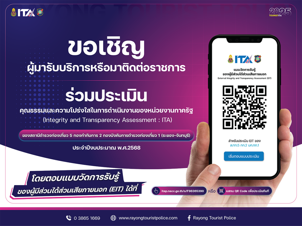 สถานีตำรวจตำรวจท่องเที่ยวระยอง ขอเชิญชวน ผู้มารับบริการ ผู้มาติดต่อสถานีตำรวจ ร่วมจัดทำแบบวัดการรับรู้ของผู้มีส่วนได้ส่วนเสียภายนอก (External Integrity and Transparency Assessment : EIT ) 2025 สำหรับนำไปพัฒนาปรับปรุงการให้บริการ คุณภาพการดำเนินงาน , การใช้อำนาจตำแหน่งหน้าที่ตามกระบวนการยุติธรรมด้วยความเป็นธรรม , ประสิทธิภาพการสื่อสารและการพัฒนาช่องทางการสื่อสารต่างๆ และนำไปปรับปรุงระบบการทำงาน
