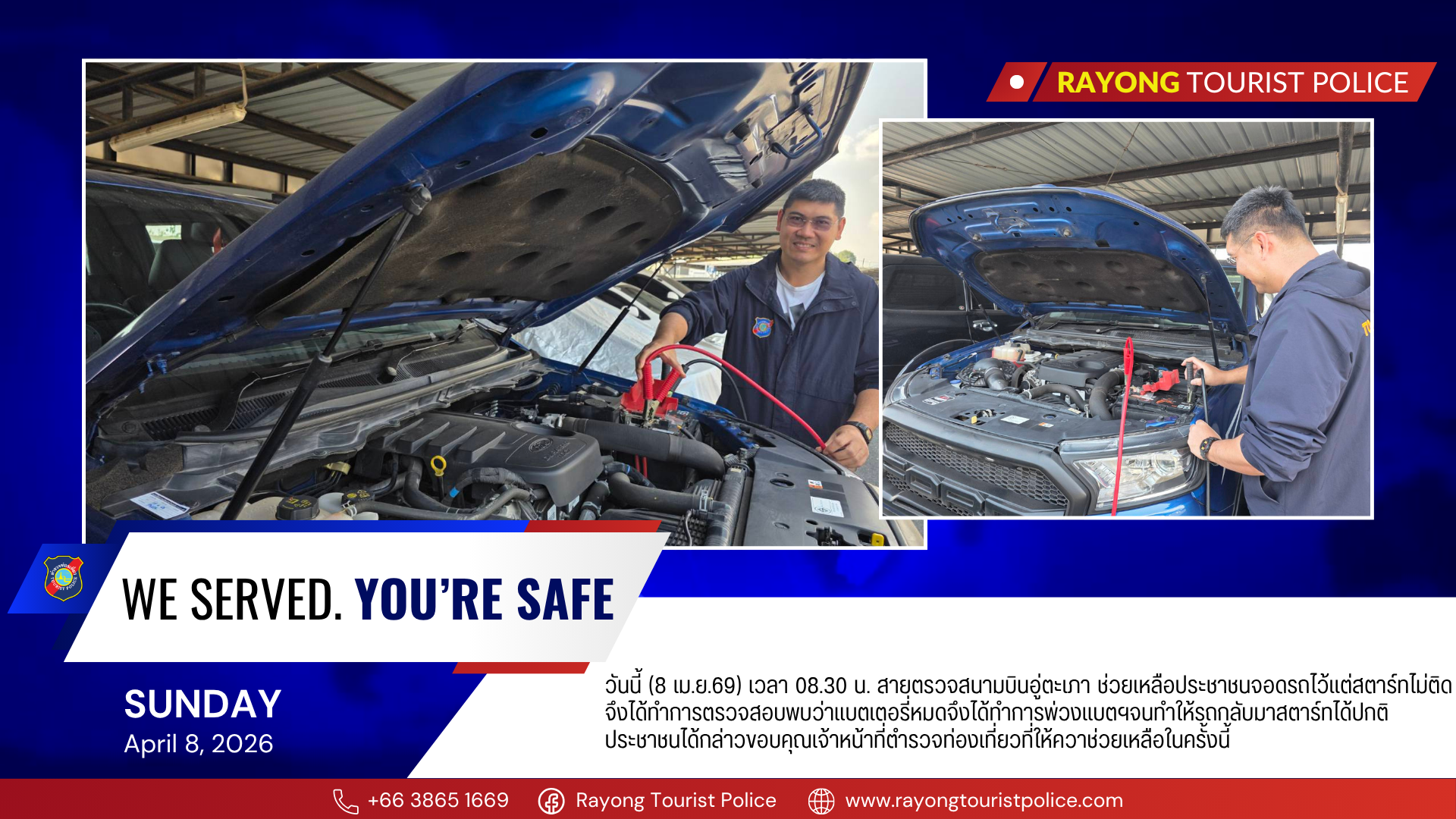 วันนี้ (8 เม.ย.69) เวลา 08.30 น. สายตรวจสนามบินอู่ตะเภา ช่วยเหลือประชาชนจอดรถไว้แต่สตาร์ทไม่ติด จึงได้ทำการตรวจสอบพบว่าแบตเตอรี่หมดจึงได้ทำการพ่วงแบตฯจนทำให้รถกลับมาสตาร์ทได้ปกติประชาชนได้กล่าวขอบคุณเจ้าหน้าที่ตำรวจท่องเที่ยวที่ให้ควาช่วยเหลือในครั้งนี้