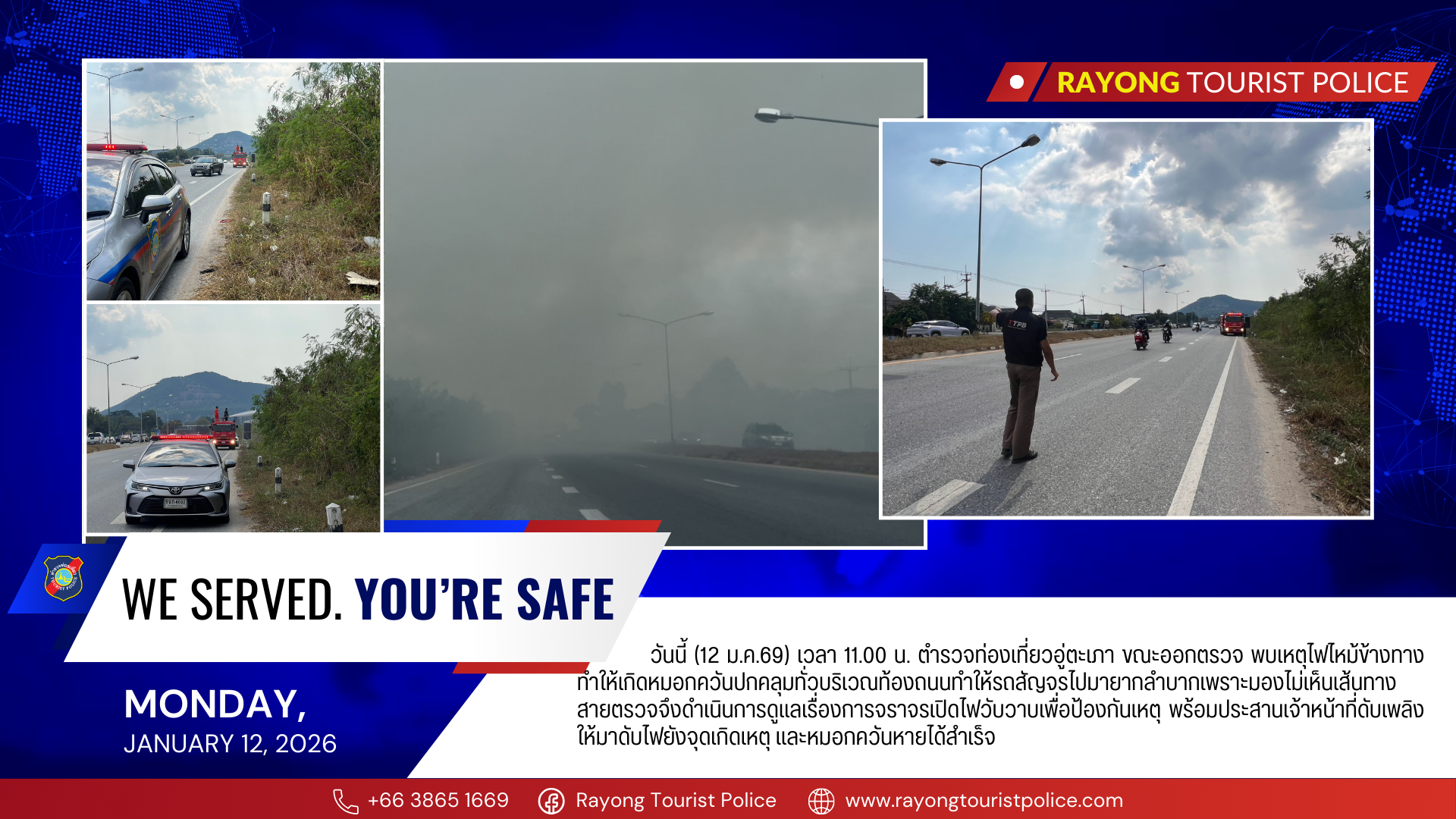 วันนี้ (12 ม.ค.69) เวลา 11.00 น. ตำรวจท่องเที่ยวอู่ตะเภา ขณะออกตรวจพบเหตุไฟไหม้ข้างทาง ทำให้เกิดหมอกควันปกคลุมทั่วบริเวณท้องถนนทำให้รถสัญจรไปมายากลำบากเพราะมองไม่เห็นเส้นทาง สายตรวจจึงดำเนินการดูแลเรื่องการจราจรเปิดไฟวับวาบเพื่อป้องกันเหตุ พร้อมประสานเจ้าหน้าที่ดับเพลิงให้มาดับไฟยังจุดเกิดเหตุและหมอกควันจางหายได้สำเร็จ