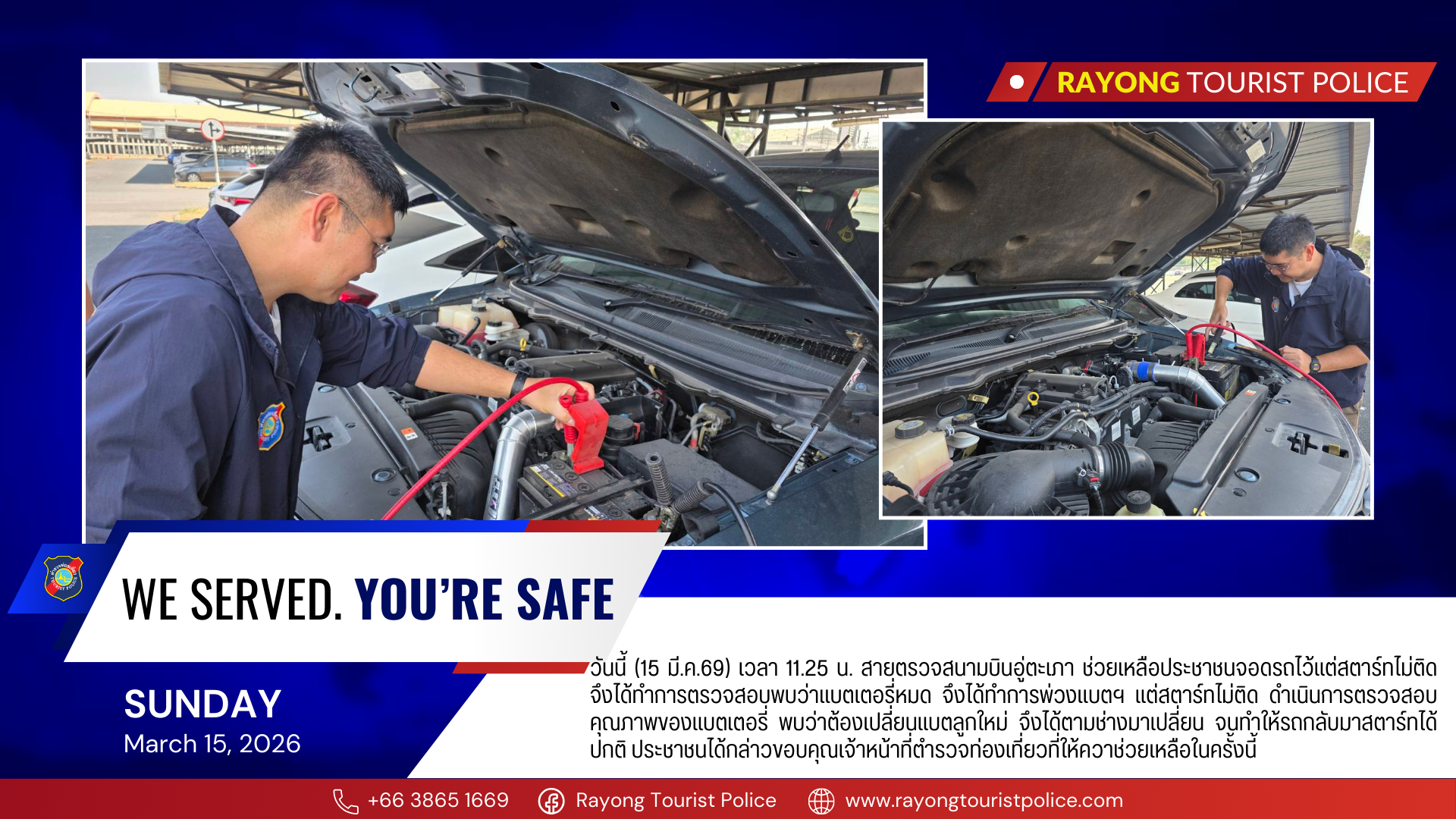 วันนี้ (15 มี.ค.69) เวลา 11.25 น. สายตรวจสนามบินอู่ตะเภา ช่วยเหลือประชาชนจอดรถไว้แต่สตาร์ทไม่ติด จึงได้ทำการตรวจสอบพบว่าแบตเตอรี่หมด จึงได้ทำการพ่วงแบตฯ แต่สตาร์ทไม่ติด ดำเนินการตรวจสอบคุณภาพของแบตเตอรี่ พบว่าต้องเปลี่ยนแบตลูกใหม่ จึงได้ตามช่างมาเปลี่ยน จนทำให้รถกลับมาสตาร์ทได้ปกติ ประชาชนได้กล่าวขอบคุณเจ้าหน้าที่ตำรวจท่องเที่ยวที่ให้ควาช่วยเหลือในครั้งนี้