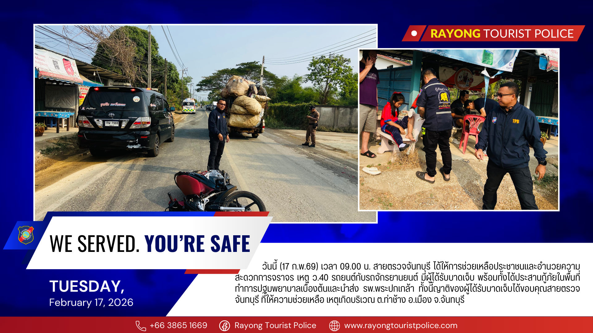 วันนี้ (17 ก.พ.69) เวลา 09.00 น. สายตรวจจันทบุรี ได้ให้การช่วยเหลือประชาชนและอำนวยความสะดวกการจราจร เหตุ ว.40 รถยนต์กับรถจักรยานยนต์ มีผู้ได้รับบาดเจ็บ พร้อมทั้งได้ประสานกู้ภัยในพื้นที่ ทำการปฐมพยาบาลเบื้องต้นและนำส่ง รพ.พระปกเกล้า ทั้งนี้ญาติของผู้ได้รับบาดเจ็บได้ขอบคุณสายตรวจจันทบุรี ที่ให้ความช่วยเหลือ เหตุเกิดบริเวณ ต.ท่าช้าง อ.เมือง จ.จันทบุรี