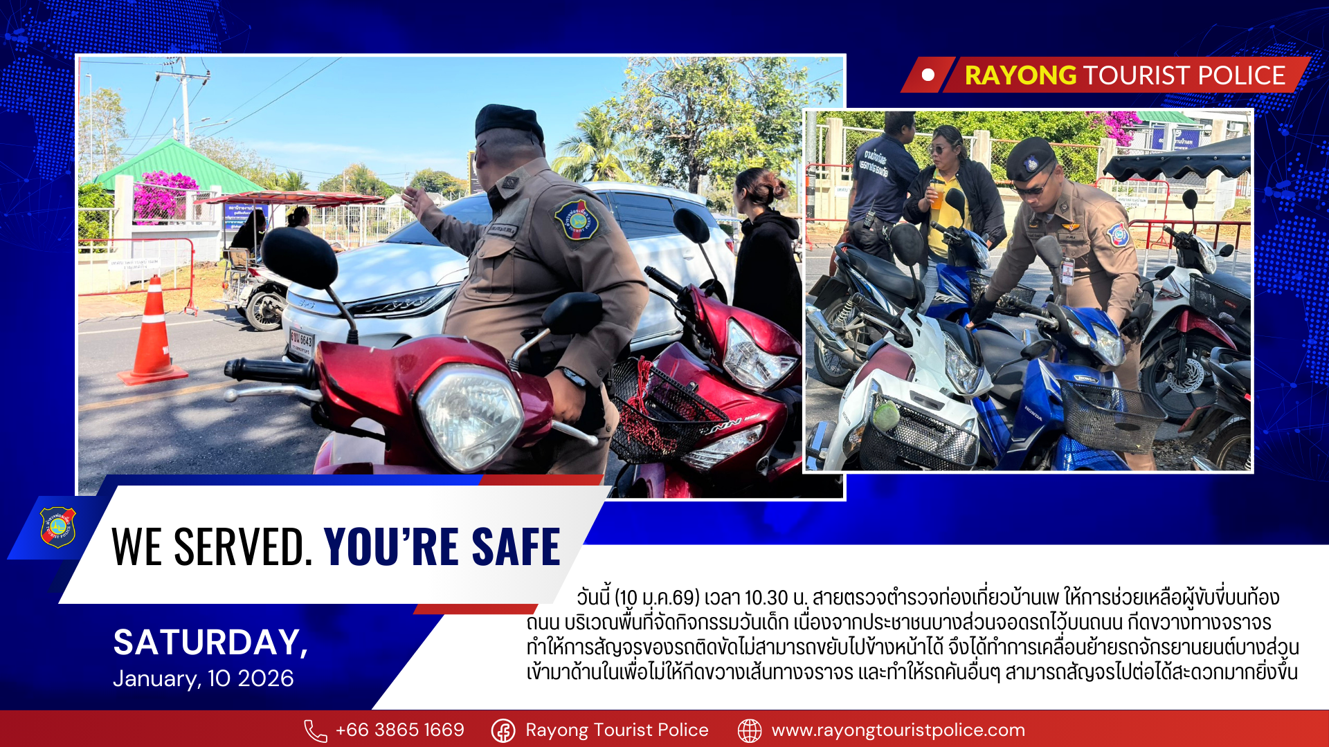 วันนี้ (10 ม.ค.69) เวลา 10.30 น. สายตรวจตำรวจท่องเที่ยวบ้านเพ ให้การช่วยเหลือผู้ขับขี่บนท้องถนน บริเวณพื้นที่จัดกิจกรรมวันเด็ก เนื่องจากประชาชนบางส่วนจอดรถไว้บนถนน กีดขวางทางจราจร ทำให้การสัญจรของรถติดขัดไม่สามารถขยับไปข้างหน้าได้ จึงได้ทำการเคลื่อนย้ายรถจักรยานยนต์บางส่วนเข้ามาด้านในเพื่อไม่ให้กีดขวางเส้นทางจราจร และทำให้รถคันอื่นๆ สามารถสัญจรไปต่อได้สะดวกมากยิ่งขึ้น