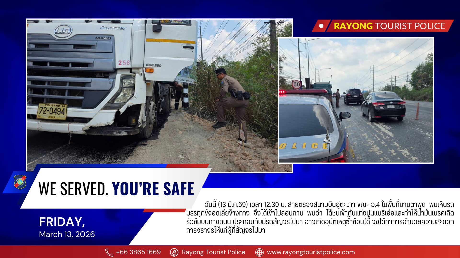 วันนี้ (13 มี.ค.69) เวลา 12.30 น. สายตรวจสนามบินอู่ตะเภา ขณะ ว.4 ในพื้นที่มาบตาพุด พบเห็นรถบรรทุกข์จอดเสียข้างทาง จึงได้เข้าไปสอบถามพบว่าได้ชนเข้ากับแท่งปูนแบริเอ่อและทำให้น้ำมันเบรคเกิดรั่วซึมบนทางถนน ประกอบกับมีรถสัญจรไปมา อาจเกิดอุบัติเหตุซ้ำซ้อนได้ จึงได้ทำการอำนวยความสะดวกการจราจรให้แก่ผู้ที่สัญจรไปมา