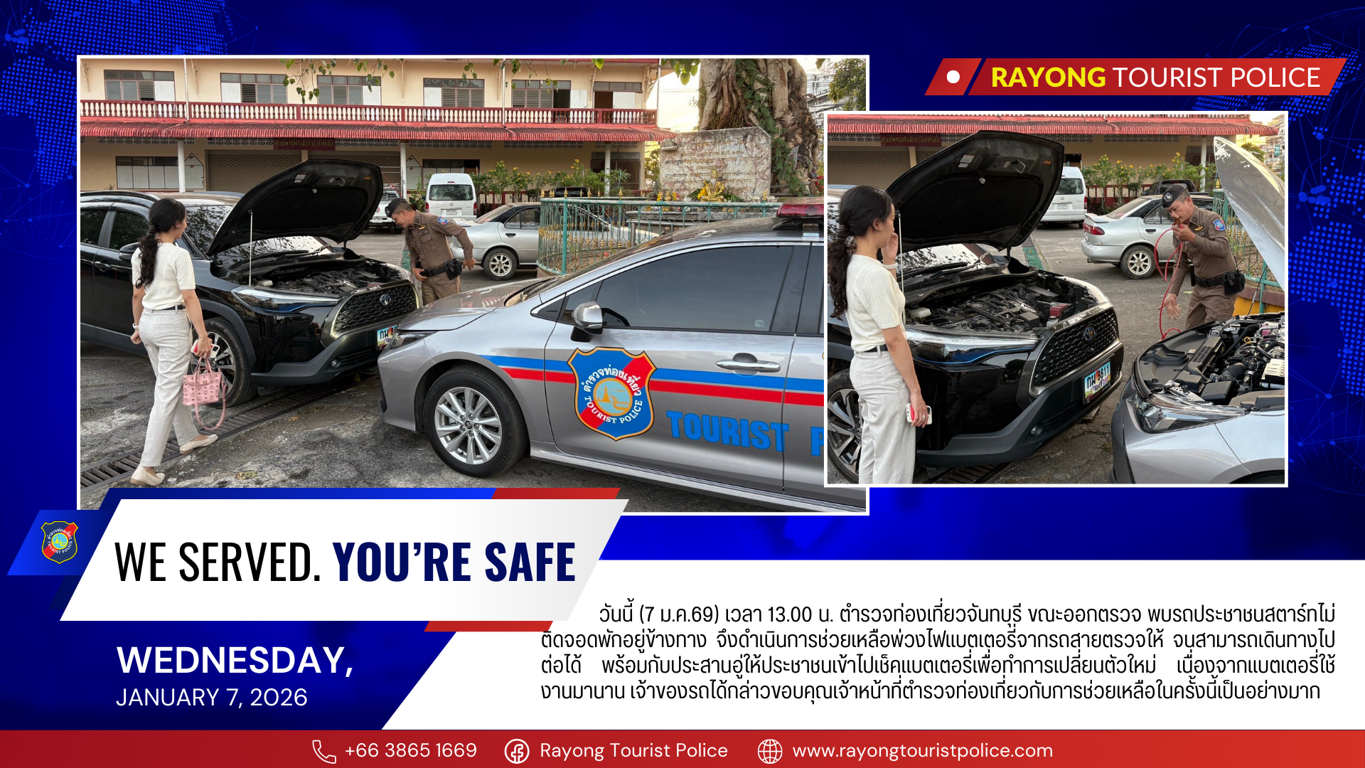 วันนี้ (7 ม.ค.69) เวลา 13.00 น. ตำรวจท่องเที่ยวจันทบุรี ขณะออกตรวจ พบรถประชาชนสตาร์ทไม่ติดจอดพักอยู่ข้างทาง จึงดำเนินการช่วยเหลือพ่วงไฟแบตเตอรี่จากรถสายตรวจให้ จนสามารถเดินทางไปต่อได้ พร้อมกับประสานอู่ให้ประชาชนเข้าไปเช็คแบตเตอรี่เพื่อทำการเปลี่ยนตัวใหม่ เนื่องจากแบตเตอรี่ใช้งานมานาน เจ้าของรถได้กล่าวขอบคุณเจ้าหน้าที่ตำรวจท่องเที่ยวกับการช่วยเหลือในครั้งนี้เป็นอย่างมาก