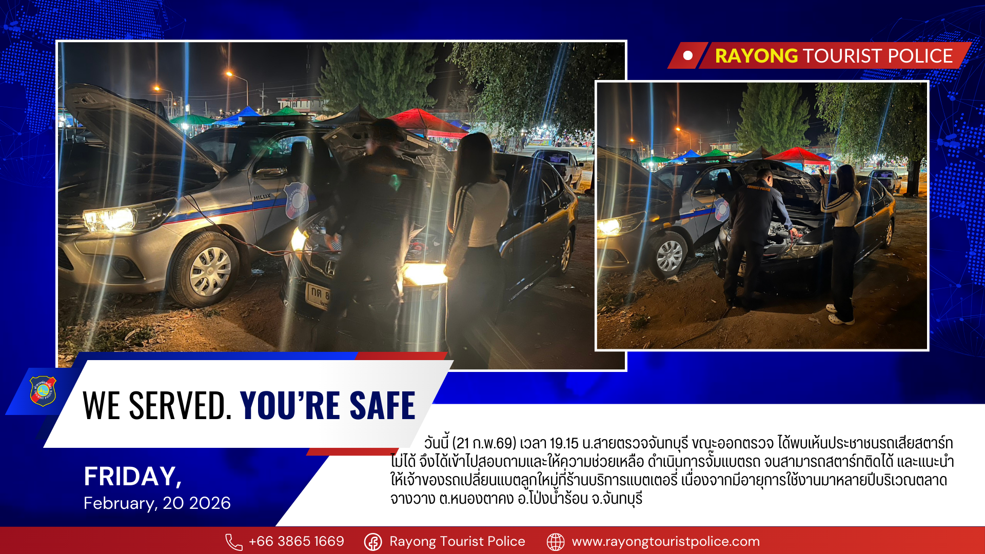 วันนี้ (21 ก.พ.69) เวลา 19.15 น.สายตรวจจันทบุรี ขณะออกตรวจ ได้พบเห็นประชาชนรถเสียสตาร์ทไม่ได้ จึงได้เข้าไปสอบถามและให้ความช่วยเหลือ ดำเนินการจั๊มแบตรถ จนสามารถสตาร์ทติดได้ และแนะนำให้เจ้าของรถเปลี่ยนแบตลูกใหม่ที่ร้านบริการแบตเตอรี่ เนื่องจากมีอายุการใช้งานมาหลายปีบริเวณตลาดจางวาง ต.หนองตาคง อ.โป่งน้ำร้อน จ.จันทบุรี