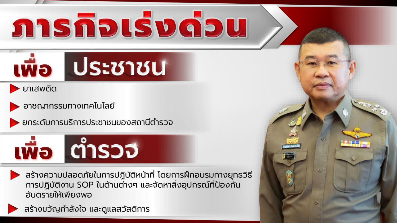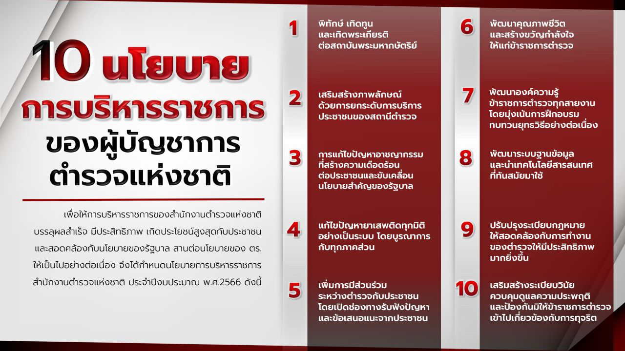 เมื่อวันที่ 1 ตุลาคม 2565 นโนบายหลักที่จะใช้ในการบริหารราชการหลัก ของ ตร. มี 10 เรื่อง คือ