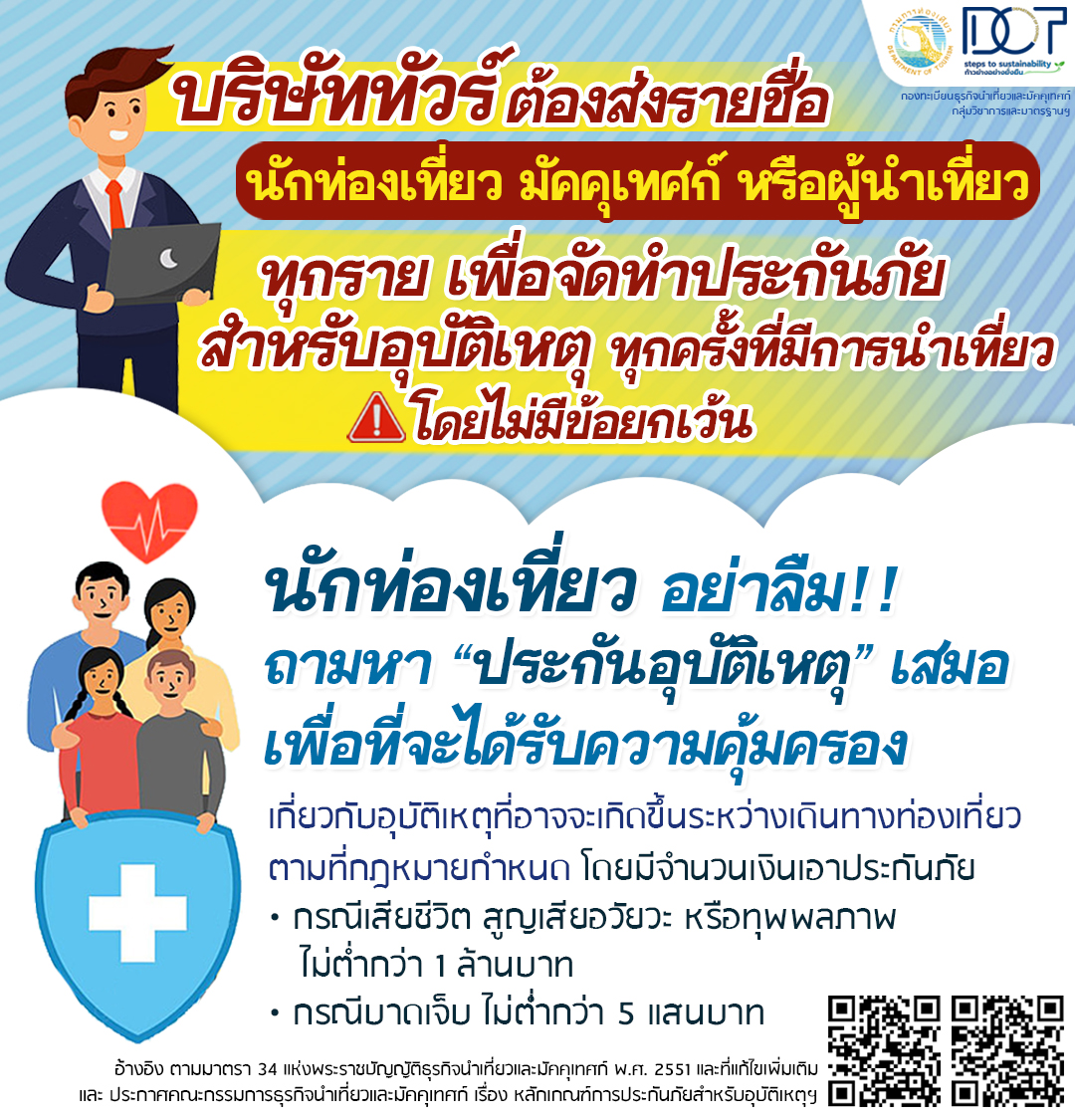 กรมการท่องเที่ยว แนะนำบริษัททัวร์ ต้องส่งรายชื่อนักท่องเที่ยว มัคคุเทศก์ หรือผู้นำเที่ยวทุกรายเพื่อจัดทำประกันภัยสำหรับอุบัติเหตุ ทุกครั้งที่มีการนำเที่ยว โดยไม่มีข้อยกเว้น