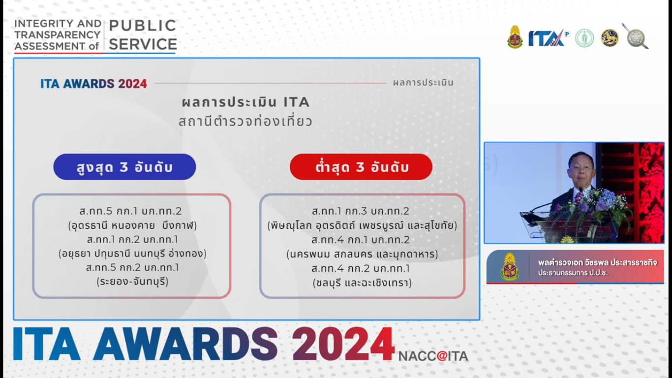 พล.ต.อ.วัชรพล ประสารราชกิจ ประธานกรรมการ ป.ป.ช. แถลงผลคะแนนและมอบรางวัล ITA AWARDS การประเมิน ITA ของหน่วยงานระดับต่ำกว่ากรม (สำนักงานเขต กรุงเทพมหานคร, อำเภอ และสถานีตำรวจ) ประจำปีงบประมาณ พ.ศ. 2567 โดยมีรายละเอียดตามแต่ละประเภทหน่วยงาน ดังนี้