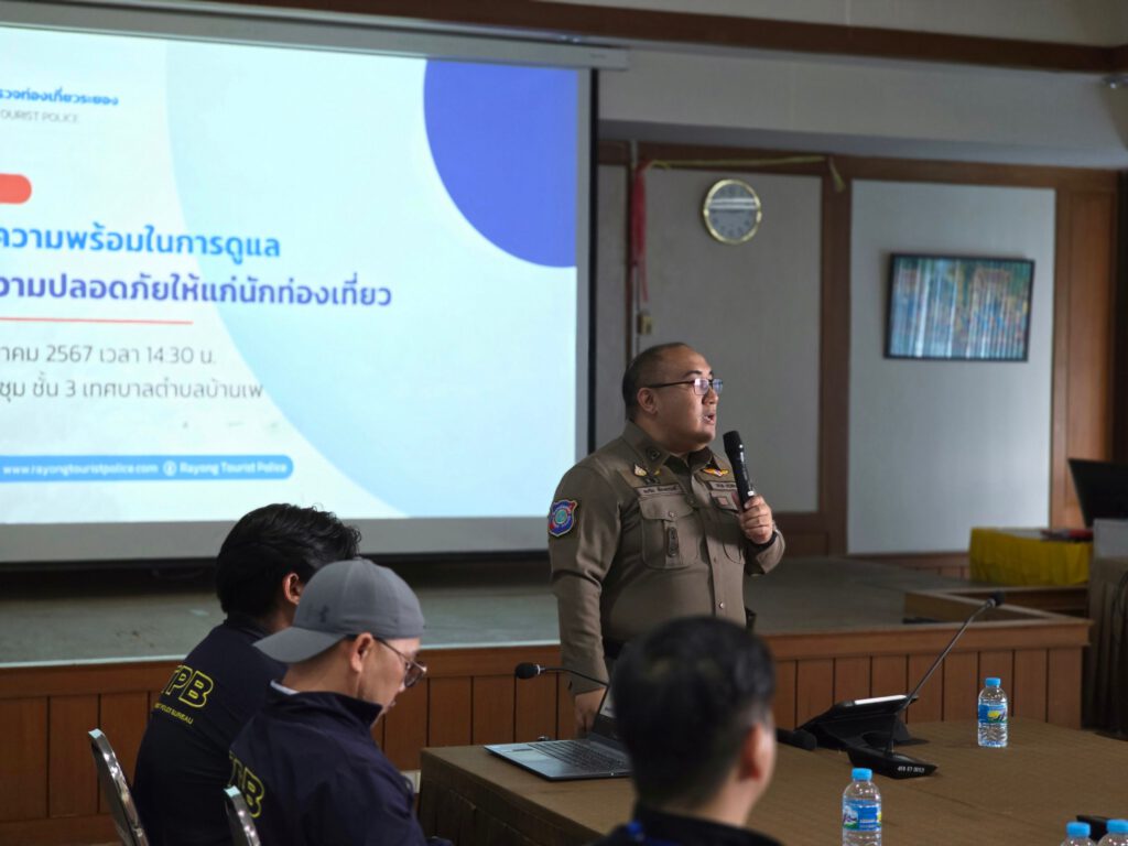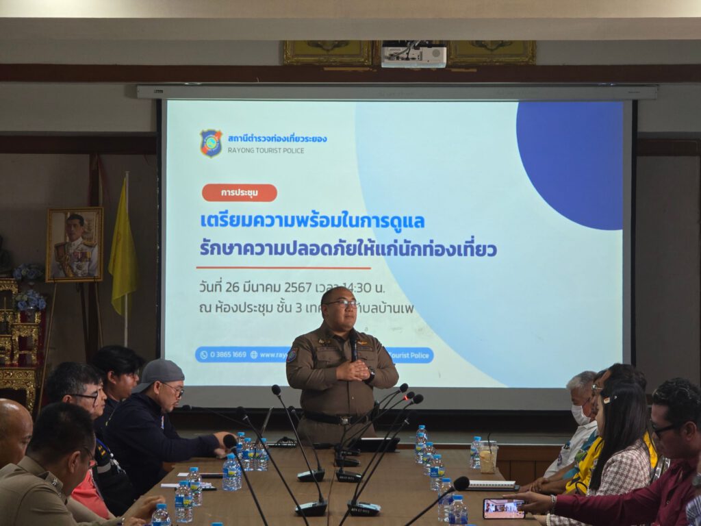 วันที่ 26 มี.ค.67 เวลา 14.30 น. พ.ต.ต.อนาวิน เฟื่องอารมย์ สว.ส.ทท.5 กก.2 บก.ทท.1 พร้อมด้วยข้าราชการตำรวจ และเจ้าหน้าที่ช่วยเหลือตำรวจท่องเที่ยว ได้เชิญผู้ประกอบการเกี่ยวกับธุรกิจนำเที่ยวและมัคคุเทศก์ ผู้ประกอบการเรือ ผู้ประกอบการรถโดยสารไม่ประจำทาง ท่าเรือต่างๆ ในพื้นที่ ต.เพ เข้าร่วมประชุมเตรียมความพร้อมในการดูแลรักษาความปลอดภัยให้แก่นักท่องเที่ยว กำหนดแนวทางร่วมกันเพื่อป้องกันเหตุที่อาจเกิดขึ้นกับนักท่องเที่ยว , แนวทางป้องกันการเอารัดเอาเปรียบนักท่องเที่ยว และขอความร่วมมือในการใช้พื้นที่เพื่อประชาสัมพันธ์สายด่วนรับแจ้งเหตุ 1155 และหมายเลขโทรศัพท์ที่ทำการตำรวจท่องเที่ยวระยอง เพื่อให้สามารถติดต่อได้ในกรณีมีเหตุฉุกเฉินที่เกิดขึ้นกับนักท่องเที่ยว ณ ห้องประชุมชั้น 3 เทศบาลตำบลบ้านเพ ต.เพ อ.เมือง จ.ระยอง