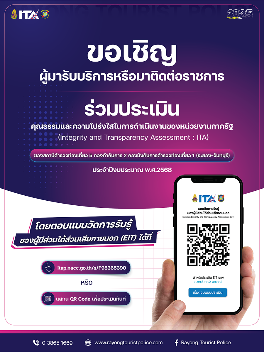 สถานีตำรวจตำรวจท่องเที่ยวระยอง ขอเชิญชวน ผู้มารับบริการ ผู้มาติดต่อสถานีตำรวจ ร่วมจัดทำแบบวัดการรับรู้ของผู้มีส่วนได้ส่วนเสียภายนอก (External Integrity and Transparency Assessment : EIT ) 2025 สำหรับนำไปพัฒนาปรับปรุงการให้บริการ คุณภาพการดำเนินงาน , การใช้อำนาจตำแหน่งหน้าที่ตามกระบวนการยุติธรรมด้วยความเป็นธรรม , ประสิทธิภาพการสื่อสารและการพัฒนาช่องทางการสื่อสารต่างๆ และนำไปปรับปรุงระบบการทำงาน โดยสามารถเข้าไปทำแบบประเมินได้ที่ https://itap.nacc.go.th/s/F98365390 หรือ QR Code (ตั้งแต่วันที่ 1 มกราคม – 30 มิถุนายน 2568)