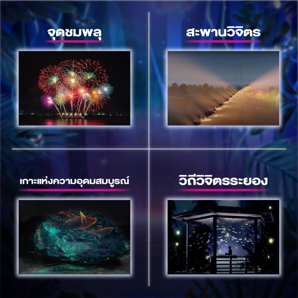 การแสดงไฮไลต์ 8 รอบต่อเนื่อง ตลอดทั้ง 9 วัน ณ บริเวณ สะพานวิจิตร เกาะแห่งความอุดมสมบูรณ์ และวิถีวิจิตรระยอง เวลา 19.00 น. 19.30 น. 20.00 น. 20.30 น. 21.00 น. 21.30 น. 22.00 น. และ 22.30 น.