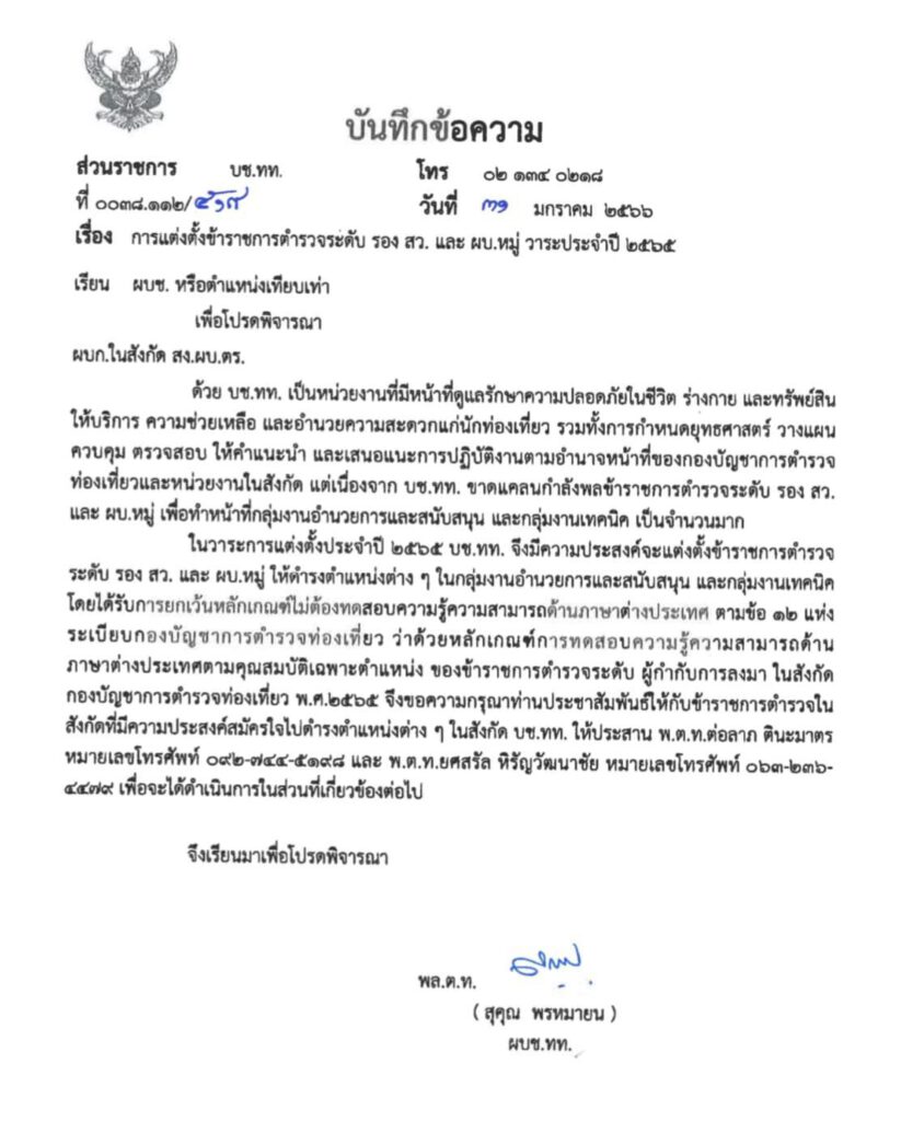 ในวาระการแต่งตั้งประจําปี 2565 บช.ทท. จึงมีความประสงค์จะแต่งตั้งข้าราชการตํารวจ ระดับ รอง สว. และ ผบ.หมู่ ให้ดํารงตําแหน่งต่าง ๆ ในกลุ่มงานอํานวยการและสนับสนุน และกลุ่มงานเทคนิค โดยได้รับการยกเว้นหลักเกณฑ์ไม่ต้องทดสอบความรู้ความสามารถด้านภาษาต่างประเทศ ตามข้อ 12 แห่งระเบียบกองบัญชาการตํารวจท่องเที่ยว ว่าด้วยหลักเกณฑ์การทดสอบความรู้ความสามารถด้านภาษาต่างประเทศตามคุณสมบัติเฉพาะตําแหน่ง ของข้าราชการตํารวจระดับผู้กํากับการลงมา ในสังกัดกองบัญชาการตํารวจท่องเที่ยว พ.ศ.2565