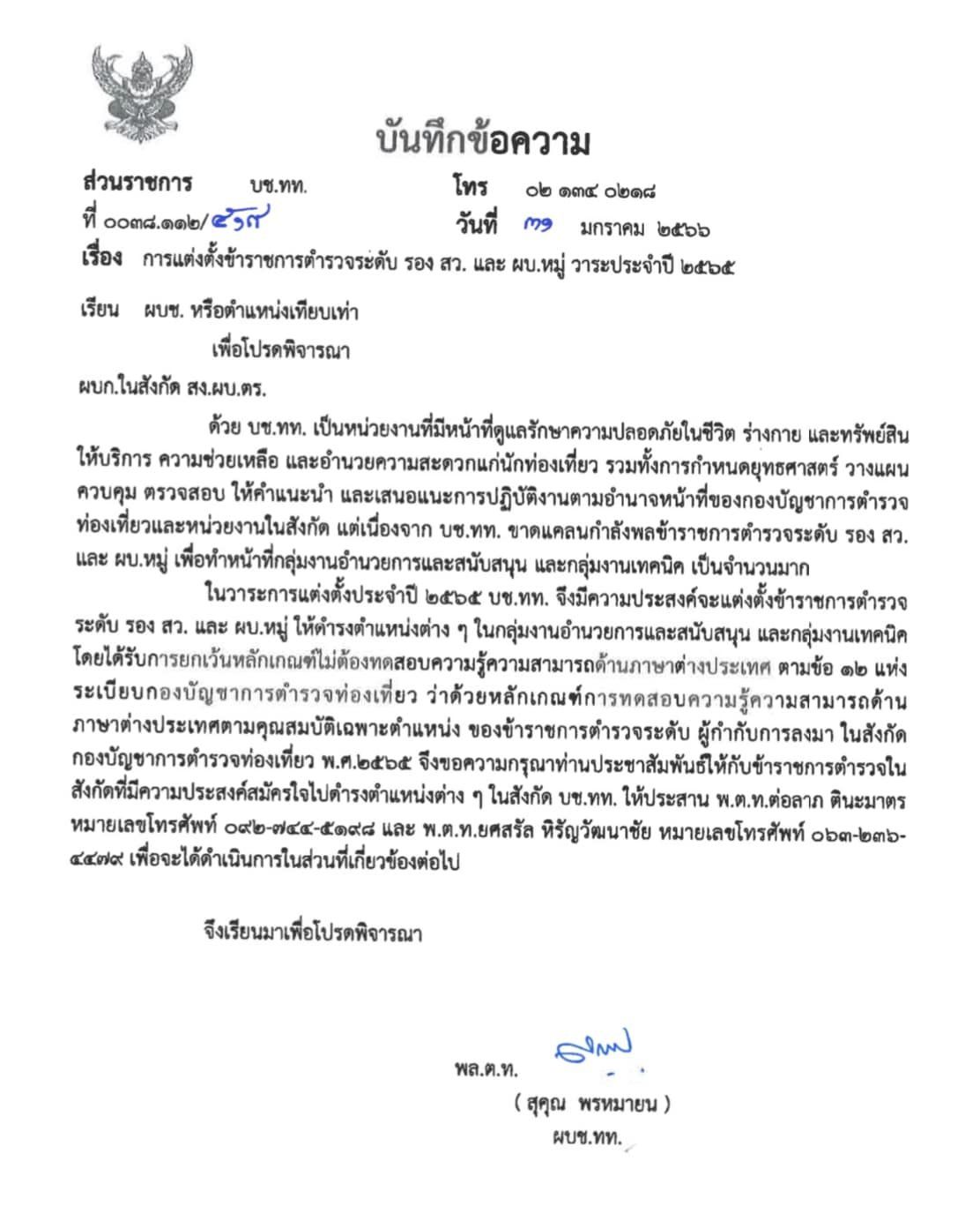ในวาระการแต่งตั้งประจําปี 2565 บช.ทท. จึงมีความประสงค์จะแต่งตั้งข้าราชการตํารวจ ระดับ รอง สว. และ ผบ.หมู่ ให้ดํารงตําแหน่งต่าง ๆ ในกลุ่มงานอํานวยการและสนับสนุน และกลุ่มงานเทคนิค โดยได้รับการยกเว้นหลักเกณฑ์ไม่ต้องทดสอบความรู้ความสามารถด้านภาษาต่างประเทศ ตามข้อ 12 แห่งระเบียบกองบัญชาการตํารวจท่องเที่ยว ว่าด้วยหลักเกณฑ์การทดสอบความรู้ความสามารถด้านภาษาต่างประเทศตามคุณสมบัติเฉพาะตําแหน่ง ของข้าราชการตํารวจระดับผู้กํากับการลงมา ในสังกัดกองบัญชาการตํารวจท่องเที่ยว พ.ศ.2565