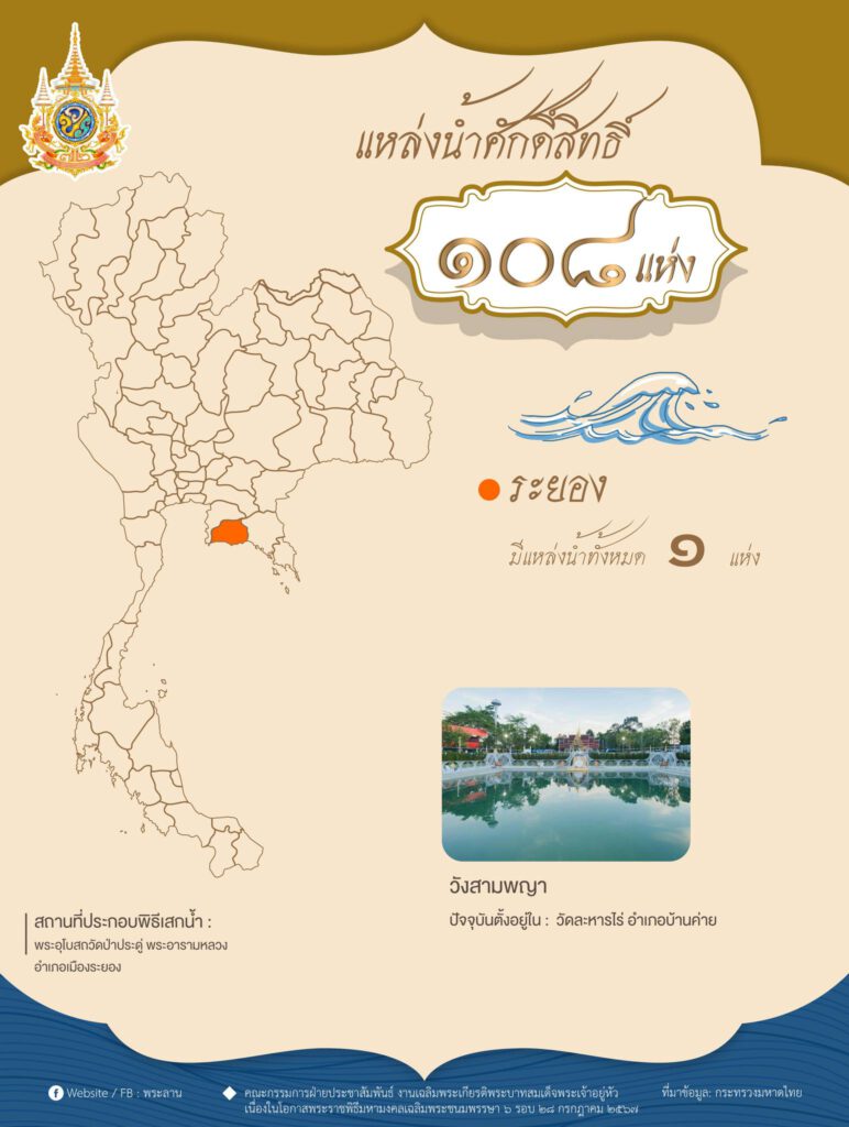 แหล่งน้ำศักดิ์สิทธิ์ 108 แห่ง ในพิธีเสกน้ำพระพุทธมนต์ศักดิ์สิทธิ์ ทูลเกล้าฯ ถวายพระบาทสมเด็จพระเจ้าอยู่หัว เนื่องในโอกาสพระราชพิธีมหามงคลเฉลิมพระชนมพรรษา 6 รอบ 28 กรกฎาคม 2567