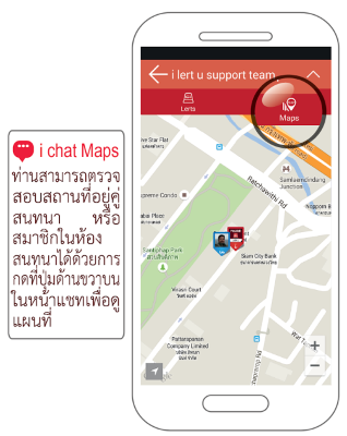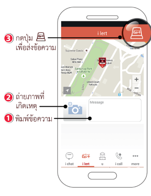 นอกจากสามารถแจ้งเบาะแสผ่านทางหน้ารายงานเหตุ i lert ได้แล้ว ยังสามารถโทรหาตำรวจผ่านทาง i CALL บนตัวแอพ หรือแชตคุยสดๆถึงตำรวจ ผ่านทาง i chat maps ถึงทีมงาน Police i lert u ได้ด้วย