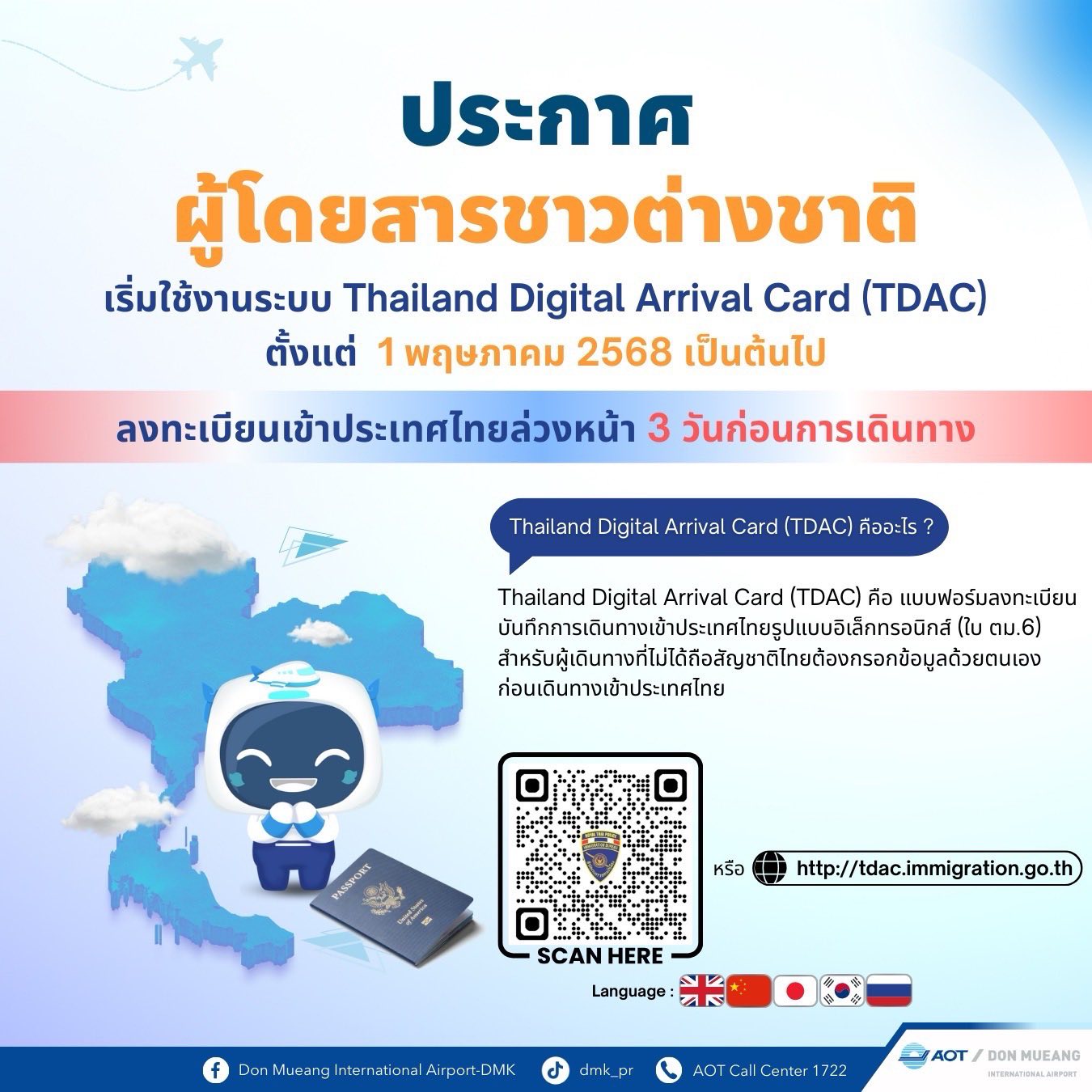 เปิดตัวระบบ Thailand Digital Arrival Card (TDAC) อย่างเป็นทางการ เพื่ออำนวยความสะดวกให้กับนักท่องเที่ยวชาวต่างชาติที่เดินทางเข้าประเทศไทย โดยนักท่องเที่ยวต่างชาติลงทะเบียนข้อมูลส่วนตัวและการเดินทางล่วงหน้าอย่างน้อย 3 วันก่อนเดินทาง ผ่านเว็บไซต์หรือ QR code อำนวยความสะดวก รวดเร็ว พร้อมรองรับ 5 ภาษา หวังยกระดับการเดินทางเข้าประเทศ เริ่มใช้งานตั้งแต่ 1 พ.ค.68 เป็นต้นไป