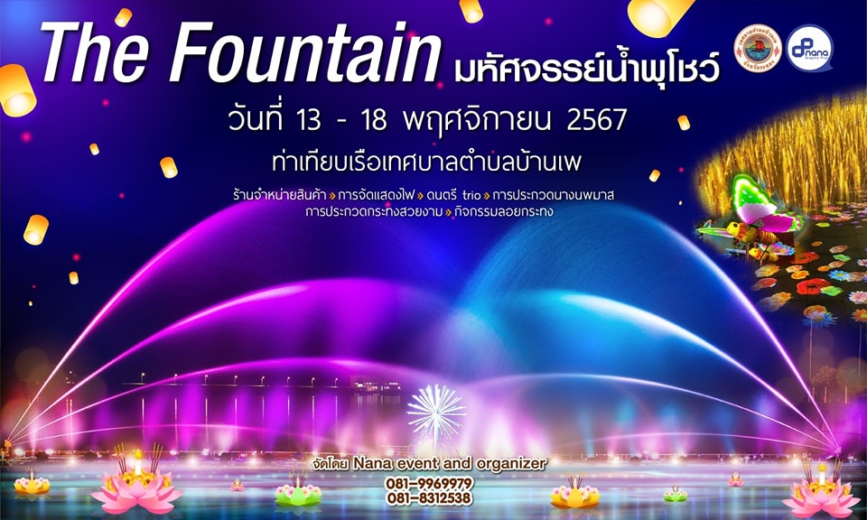 ลอยกระทงปีนี้ ชมโชว์น้ำพุเต้นระบำ มาพร้อม กับการจัดแสดง ไฟ แสงสี illumination สวยสะดุดตา แปลกตาสะดุดใจ ณ ท่าเทียบเรือเทศบาลตำบลบ้านเพ ต.เพ อ.เมือง จ.ระยอง